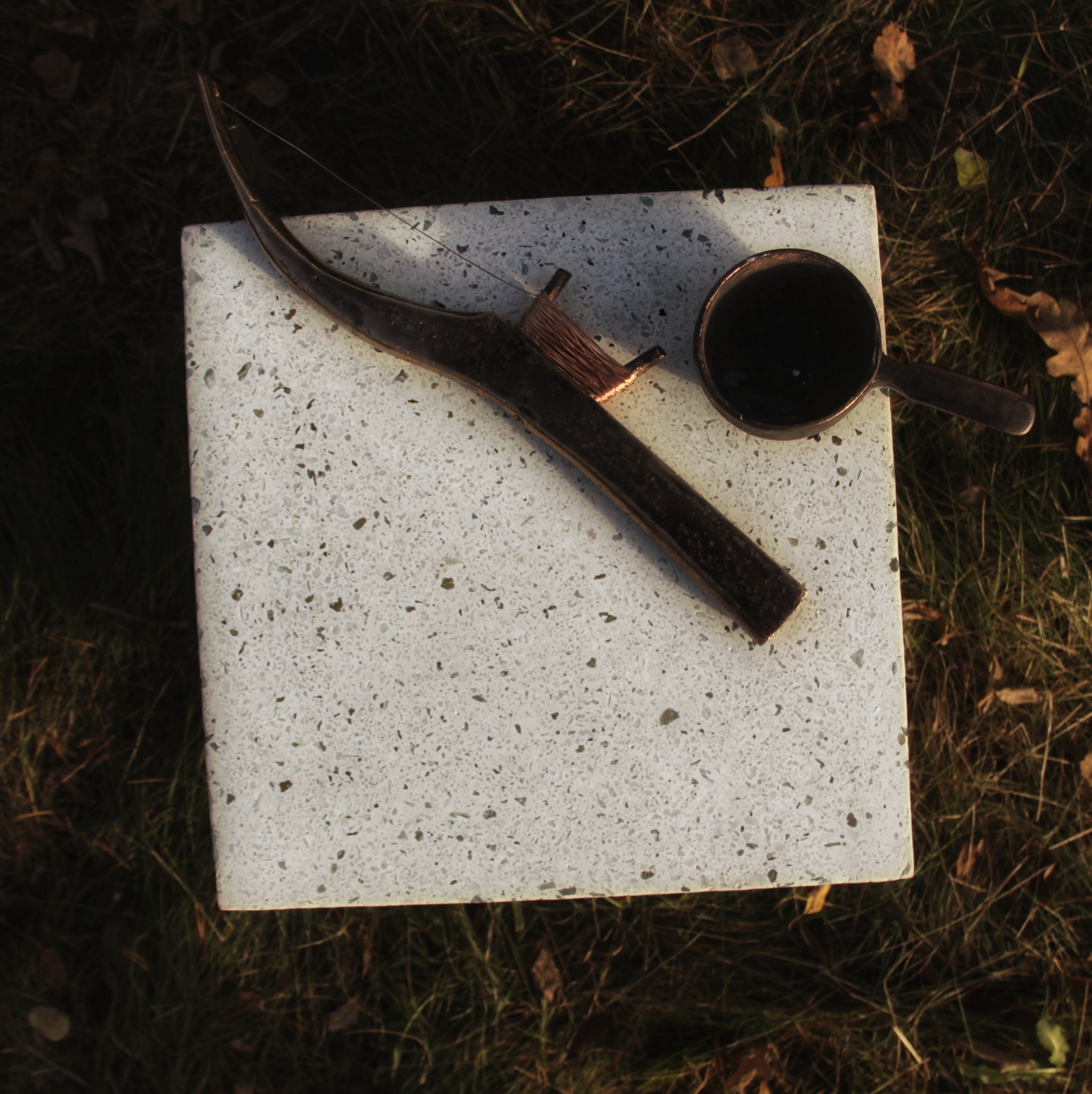 Jag gjöt ett av dem i brons tillsammans med hans kåsa och placerade dem som de skulle vara om han tog en paus i isfisket. De sitter monterade i ett block av polerad terrazzo av vit Portland cement, och vit och grön marmorkross, som för mig symboliserar snön på isen och granriset han satt på.